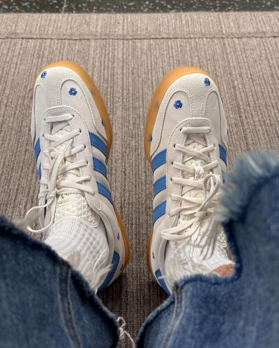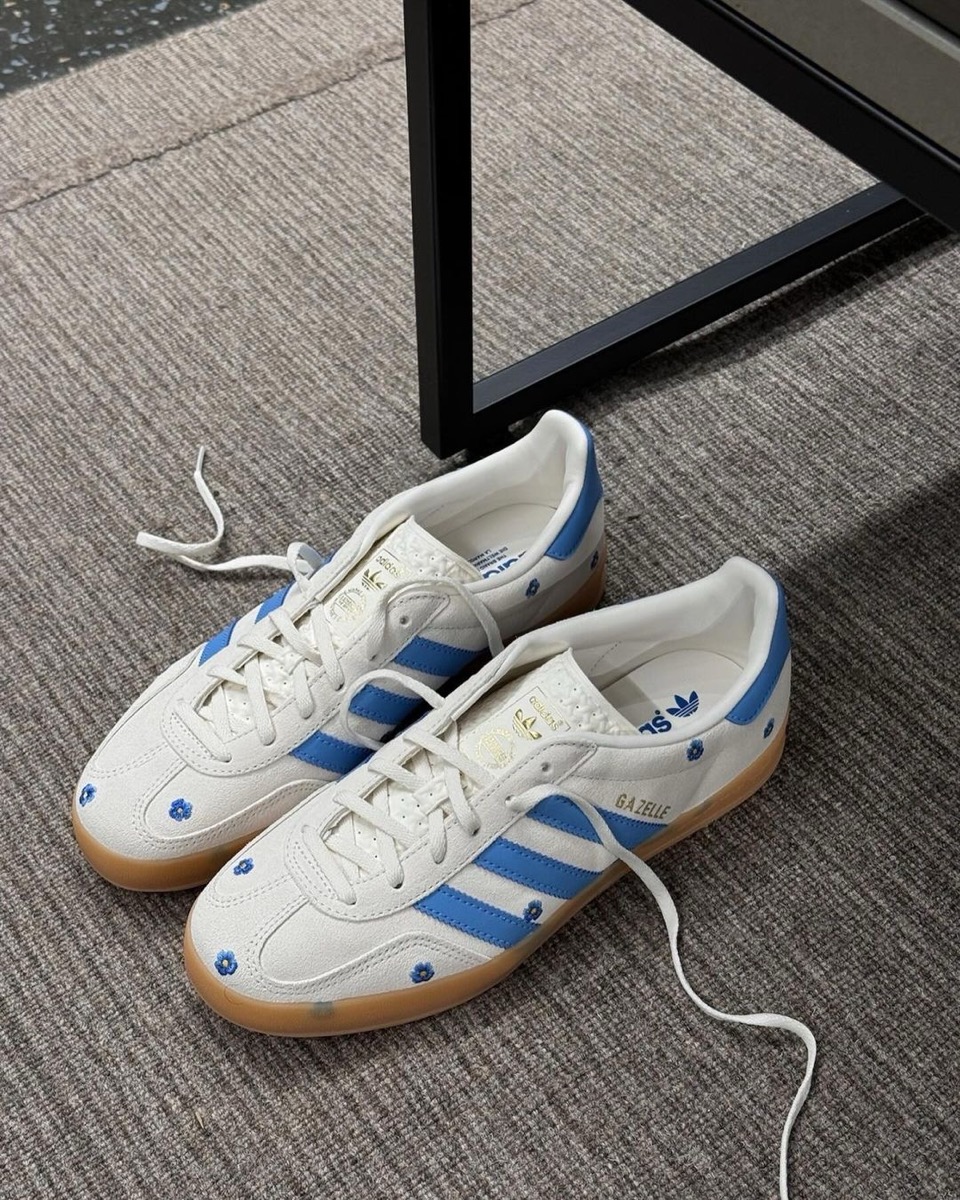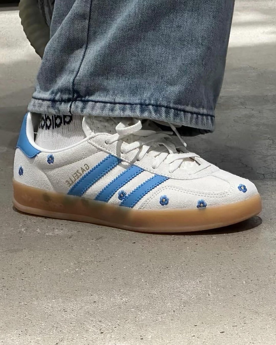 アディダス『ガゼル インドア』に、ライトブルーの花の刺繍があしらわれた新作が登場。[IF4491 / IF4490]